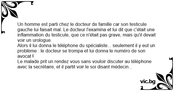 Un homme est parti chez le docteur de famille car son testicule gauche lui faisait mal. Le docteur l'examina et lui dit que c'était une inflammation du testicule, que ce n'était pas grave, mais qu'il devait voir un urologue.