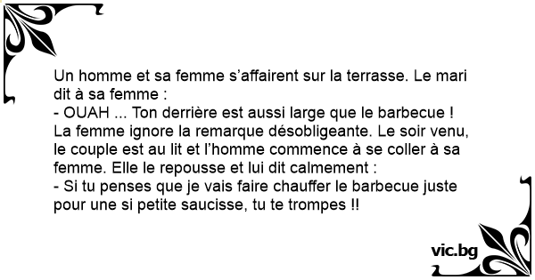 Un homme regarde sa femme penchée sur le balcon et lui dit : - Chérie, ton derrière est aussi large que le barbecue !!! Choquée elle ne répond rien. La nuit venue, dans le lit monsieur, ayant envie...
