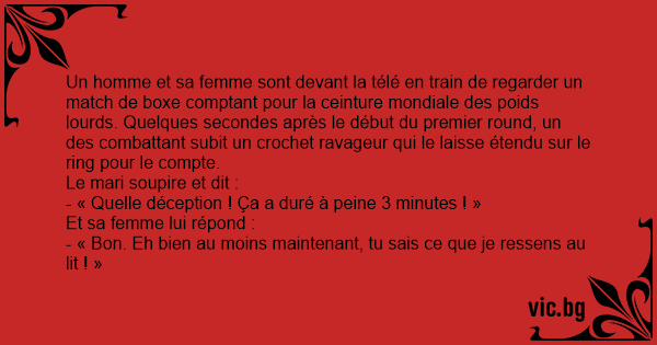 Manden og konen ser boksning på TV. Manden: Øv hvor skuffende, nu har jeg ventet på det her i over 4 uger og så er kampen ovre på 4 minutter. Konen: Det kender jeg godt!