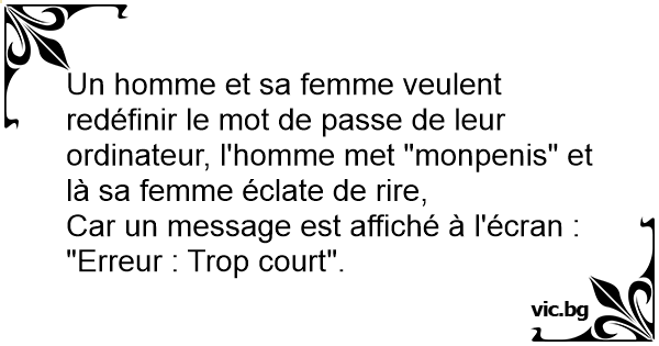 Un homme et sa femme veulent redéfinir le mot de passe de leur ordinateur, l'homme met "monpenis" et là sa femme éclate de rire,