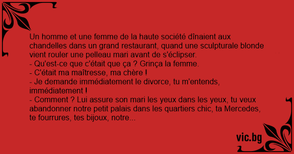 - Je demande immédiatement le divorce, tu m'entends, immédiatement !
