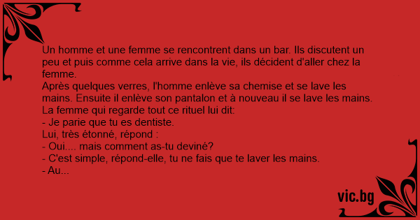 Un couple a fait l'amour pour la première fois. Après tout ça, le mec demande à sa copine qui va se laver les mains : - Dis-moi, tu voudrais être infirmière plus tard ? - Non. Pourquoi ? - Parce...