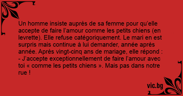 Un homme insiste auprès de sa femme pour qu’elle accepte de faire l’amour comme les petits chiens (en levrette). Elle refuse catégoriquement. Le mari en est surpris mais continue à lui demander, année après année. Après vingt-cinq ans de mariage, elle répond :