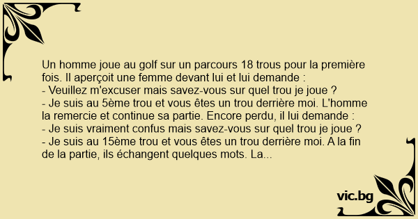 - Je suis au 5ème trou et vous êtes un trou derrière moi. L'homme la remercie et continue sa partie. Encore perdu, il lui demande :