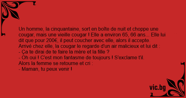 C'est une femme cougar de 40 ans qui ramène un petit jeune de 25 ans chez elle. Arrivés à la maison, elle lui dit :