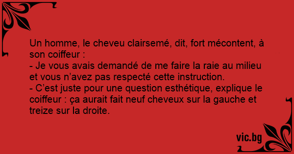- C’est juste pour une question esthétique, explique le coiffeur : ça aurait fait neuf cheveux sur la gauche et treize sur la droite.