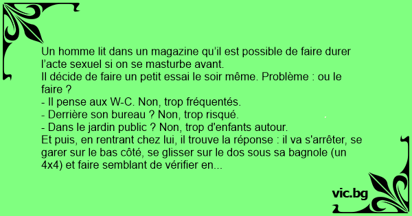 Et puis, en rentrant chez lui, il trouve la réponse : il va s'arrêter, se garer sur le bas côté, se glisser sur le dos sous sa bagnole (un 4x4) et faire semblant de vérifier en dessous. Il y va, baisse son froc, ferme les yeux et pense très fort à sa copine.