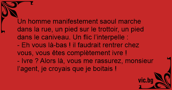 - Ivre ? Alors là, vous me rassurez, monsieur l’agent, je croyais que je boitais !