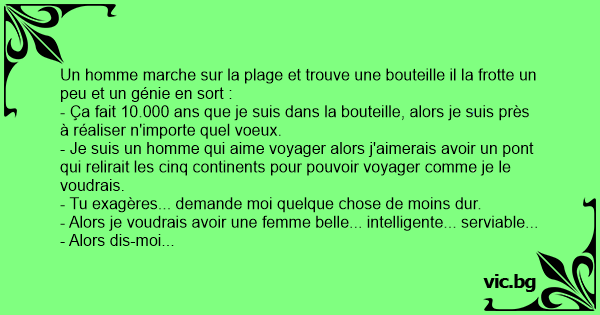 Un homme marche sur la plage et trouve une bouteille il la frotte un peu et un génie en sort :