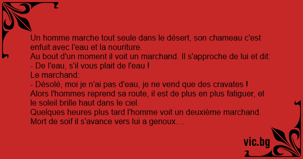 Quelques heures plus таrd l'homme voit un deuxième marchand. Mort de soif il s'avance vers lui a genoux. Et il lui dit: