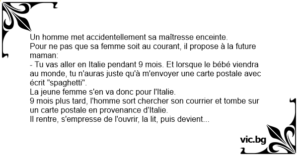 Un avvocato ha una relazione clandestina con la sua segretaria. Quando la donna rimane incinta, per non essere scoperto dalla moglie, le suggerisce di farsi un lungo viaggio, da lui spesato. La donna allora chiede: "E come faccio a dirti quando è nato il bambino?" "Mandami una cartolina con...
