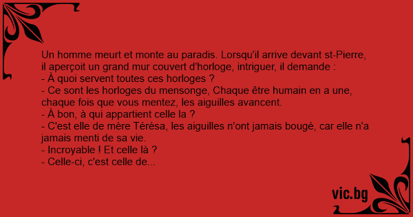 Un homme meurt et monte au paradis. Lorsqu'il arrive devant st-Pierre, il aperçoit un grand mur couvert d'horloge, intriguer, il demande :