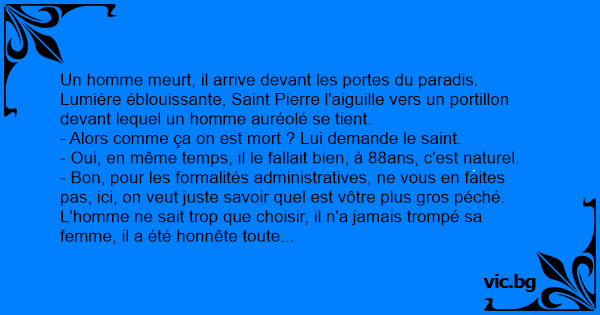 Un homme meurt, il arrive devant les portes du paradis. Lumière éblouissante, Sаinт Pierre l'aiguille vers un portillon devant lequel un homme auréolé se tient.