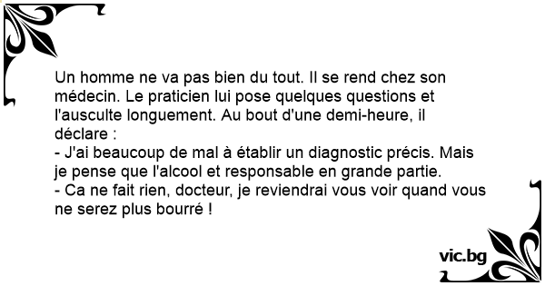 Un homme ne va pas bien du tout. Il se rend chez son médecin. Le praticien lui pose quelques questions et l'ausculte longuement. Au bout d'une demi-heure, il déclare :