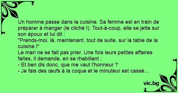 Un homme passe dans la cuisine. Sa femme est en train de préparer à manger (le cliché !). Tout-à-coup, elle se jette sur son époux et lui dit :