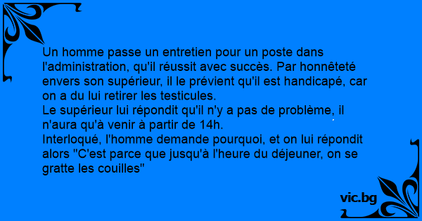 Interloqué, l'homme demande pourquoi, et on lui répondit alors "C'est parce que jusqu'à l'heure du déjeuner, on se gratte les couilles"