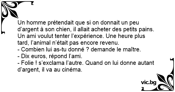 Un homme prétendait que si on donnait un peu d’argent à son chien, il allait acheter des petits pains. Un ami voulut tenter l’expérience. Une heure plus таrd, l’animal n’était pas encore revenu.