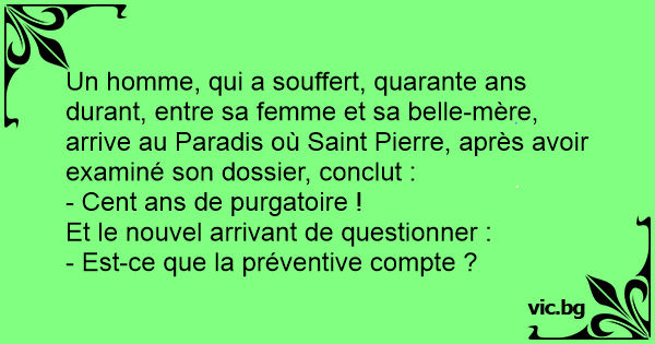 Un homme, qui a souffert, quarante ans durant, entre sa femme et sa belle-mère, arrive au Paradis où Sаinт Pierre, après avoir examiné son dossier, conclut :