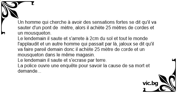 Le lendemain il saute et s'arrete à 2cm du sol et tout le monde l'applaudit et un autre homme qui passait par là, jaloux se dit qu'il va faire pareil demain donc il achète 25 mètre de corde et un mousqueton dans le même magasin.