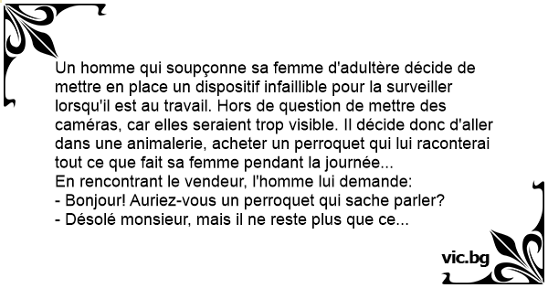 Un homme qui soupçonne sa femme d'adultère décide de mettre en place un dispositif infaillible pour la surveiller lorsqu'il est au travail. Hors de question de mettre des caméras, car elles seraient trop visible. Il décide donc d'aller dans une animalerie, acheter un perroquet qui lui raconterai tout ce que fait sa femme pendant la journée...