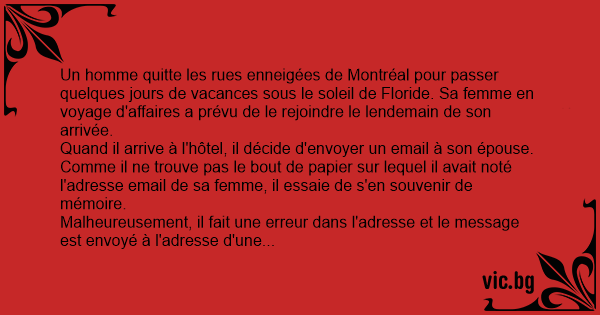 Malheureusement, il fait une erreur dans l'adresse et le message est envoyé à l'adresse d'une femme veuve depuis la veille. Quand celle-ci consulte ses emails, elle lit ce qu'il y a à l'écran, pousse un cri d'horreur et meurt d'une crise cardiaque.