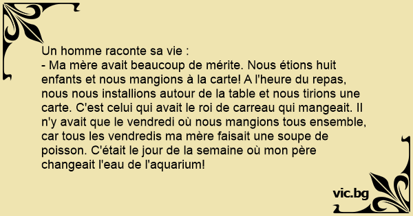 - Ma mère avait beaucoup de mérite. Nous étions huit enfants et nous mangions à la carte! A l'heure du repas, nous nous installions autour de la table et nous tirions une carte. C'est celui qui avait le roi de carreau qui mangeait. Il n'y avait que le vendredi où nous mangions tous ensemble, car tous les vendredis ma mère faisait une soupe de poisson. C'était le jour de la semaine où mon père changeait l'eau de l'aquarium!
