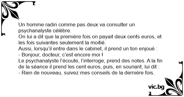 Le psychanalyste l’écoute, l’interroge, prend des notes. A la fin de la séance il prend les cent euros, puis, en souriant, lui dit :