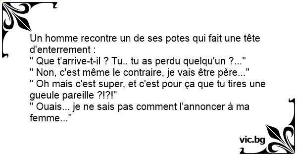 - Coucou, ça va ? - Mouais, pas trop... - Qu'est ce qu'il y a ? - Je vais être papa... - Mais c'est génial ! - Oui, mais comment est-ce que je vais l'annoncer à ma femme, moi ?