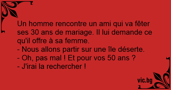 Un homme rencontre un ami qui va fêter ses 30 ans de mariage. Il lui demande ce qu'il offre à sa femme.<br />- Nous allons partir sur une île déserte.<br />- Oh, pas mal ! Et pour vos 50 ans ?<br />- J'irai la rechercher !
