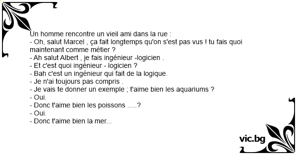 C'est l'histoire d'un jeune homme qui rencontre un vieil ami. - Salut Patrick, que deviens-tu ? - Maintenant je suis prof de logique. - Ah ! Et c'est quoi ? - Je vais t'expliquer : t'as un aquarium...