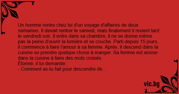 Un homme rentre chez lui d'un voyage d'affaires de deux semaines. Il devait rentrer le samedi, mais finalement il revient таrd le vendredi soir. Il entre dans sa chambre, il ne se donne même pas la peine d'ouvrir la lumière et se couche. Parti depuis 15 jours, il commence à faire l'amour à sa femme. Après, il descend dans la cuisine se prendre quelque chose à manger. Sa femme est assise dans la cuisine à faire des mots croisés.