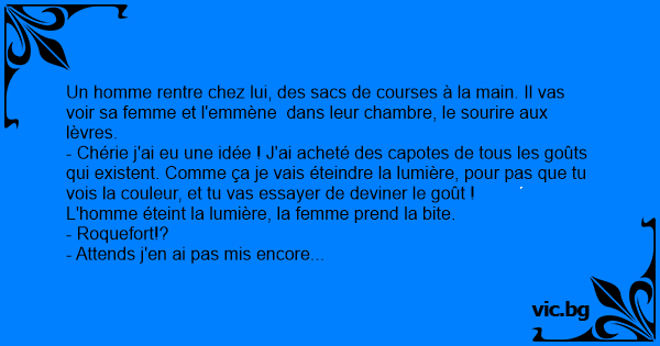 - Chérie j'ai eu une idée ! J'ai acheté des capotes de tous les goûts qui existent. Comme ça je vais éteindre la lumière, pour pas que tu vois la couleur, et tu vas essayer de deviner le goût !