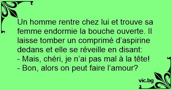 Un homme rentre chez lui et trouve sa femme endormie la bouche ouverte. Il laisse tomber un comprimé d’aspirine dedans et elle se réveille en disant: