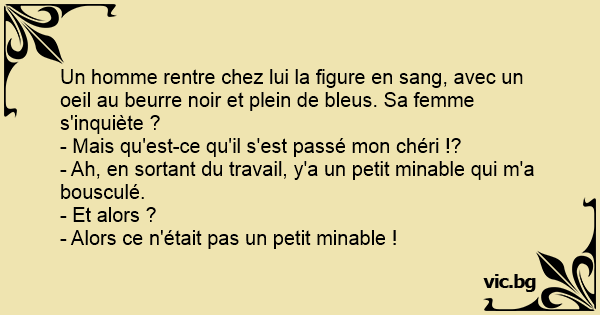Un homme rentre chez lui la figure en sang, avec un oeil au beurre noir et plein de bleus. Sa femme s'inquiète ?