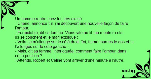 - Chérie, annonce-t-il, j’ai découvert une nouvelle façon de faire l’amour.