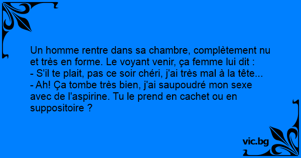 Un mec sort de sa salle de bain et arrive devant sa femme en bandant comme un taureau. En le voyant, sa femme lui dit: "Pas ce soir, chéri, j’ai mal à la tête." Le mec répond: "Pas de problème. J’ai mis de l’aspirine sur ma bite. Tu le veux en cachet ou en suppositoire?"