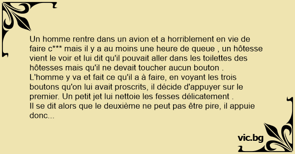 Un homme rentre dans un avion et a horriblement en vie de faire c*** mais il y a au moins une heure de queue , un hôtesse vient le voir et lui dit qu'il pouvait aller dans les toilettes des hôtesses mais qu'il ne devait toucher aucun bouton .