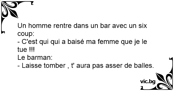 Furieux, un type armé d'un fusil entre dans un bar bondé et se met à hurler : - Je veux savoir quel est le salaud qui baise ma femme ! Une voix répond : - Calme toi. De toute façon, t'auras jamais...
