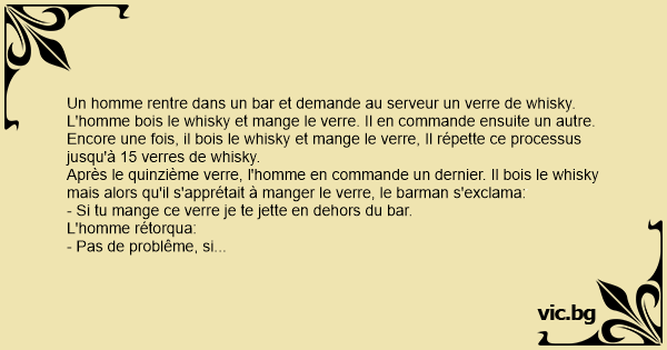 Après le quinzième verre, l'homme en commande un dernier. Il bois le whisky mais alors qu'il s'apprétait à manger le verre, le barman s'exclama: