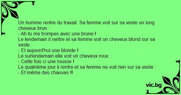 Le lendemain il rentre et sa femme voit un cheveux blond sur sa veste :