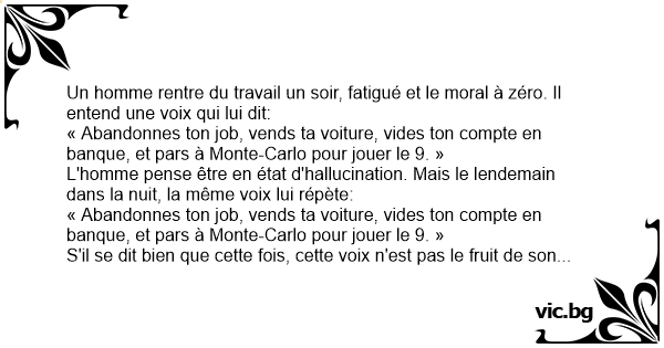 « Abandonnes ton job, vends ta voiture, vides ton compte en banque, et pars à Monte-Carlo pour jouer le 9. » Au bout de quelques semaines, il finit par craquer.