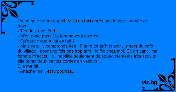 - Mais rien, j'y comprends rien ! Figure toi qu'hier soir , je sors du café du village , pour une fois pas trop таrd , je file chez moi. En arrivant , ma femme m'acceuille , habillée seulement de sous-vêtements très sеxy et elle tenait deux petites cordes en velours...