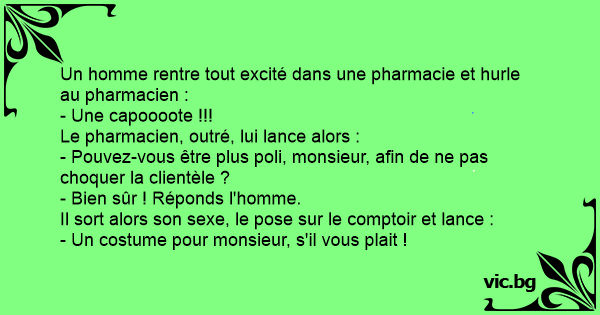Un homme rentre tout excité dans une pharmacie et hurle au pharmacien :