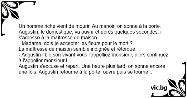 Augustin s'excuse et repart. Une heure plus таrd, on sonne encore une fois. Augustin retourne à la porte, ouvre puis se tourne vers la maîtresse de maison: