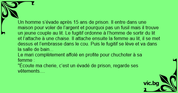 "Écoute ma cherie, c’est un évadé de prison, regarde ses vêtements. Ça doit faire longtemps qu’il n’a pas vu de femme. J’ai vu comme il t’a embrassé dans le cou. S’il veut du sexe ne résiste pas, fais ce qu’il te dit. Donne lui satisfaction même si ca te répugne car si il se fâche il peut nous tuer. sois forte chérie! Je t’aime!"