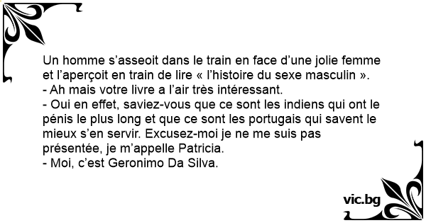 Un homme s’asseoit dans le train en face d’une jolie femme et l’aperçoit en train de lire « l’histoire du sexe masculin ».