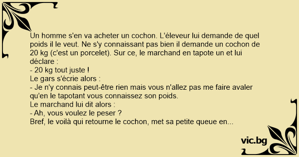 Un homme s'en va acheter un cochon. L'éleveur lui demande de quel poids il le veut. Ne s'y connaissant pas bien il demande un cochon de 20 kg (c'est un porcelet). Sur ce, le marchand en tapote un et lui déclare :