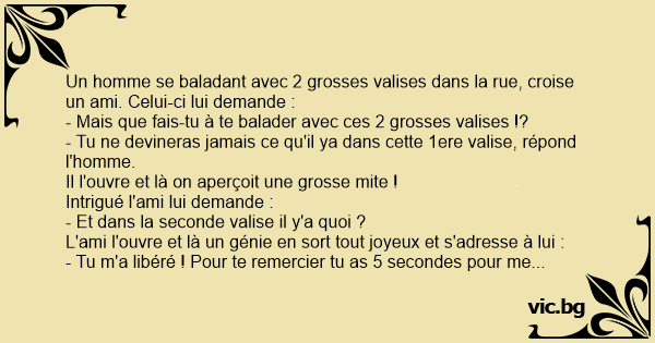 Un homme se baladant avec 2 grosses valises dans la rue, croise un ami. Celui-ci lui demande :
