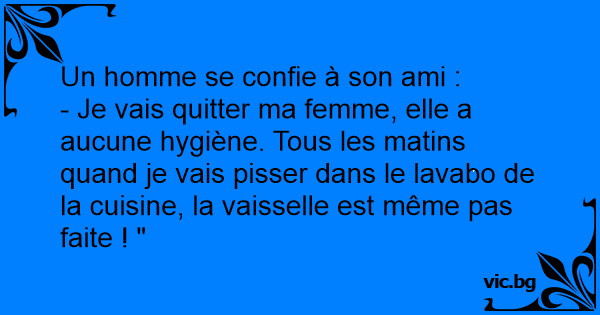 - Je vais quitter ma femme, elle a aucune hygiène. Tous les matins quand je vais рissеr dans le lavabo de la cuisine, la vaisselle est même pas faite ! "