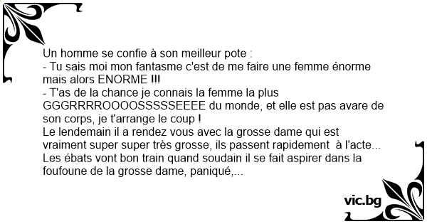 Le lendemain il a rendez vous avec la grosse dame qui est vraiment super super très grosse, ils passent rapidement à l'acte... Les ébats vont bon train quand soudain il se fait aspirer dans la foufoune de la grosse dame, paniqué, il cherche vainement la sortie et à taton fini par trouver un interupteur, il allume la lumière, mais ne trouve pour autant la sortie. Il se met à crier "au secours !!! au secours !!!"